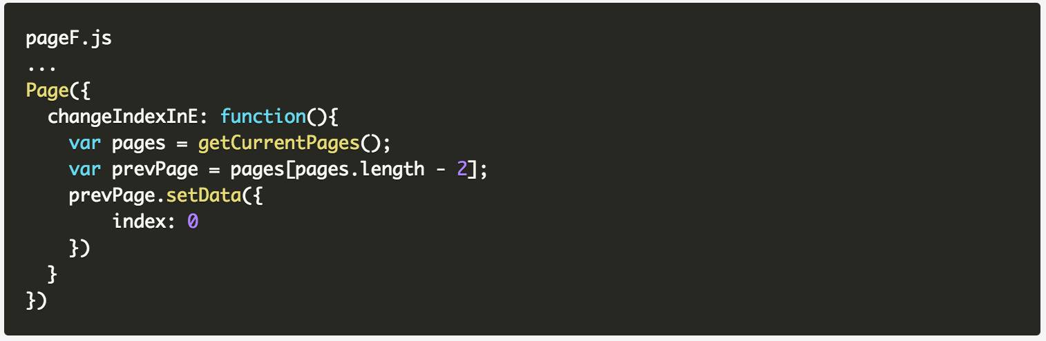 这个方法的精髓,是通过获取到其他页面的对象原型, 然后通过原型方法 setData对当前对象管理的 data进行修改,示例如下: