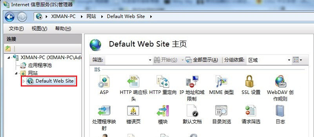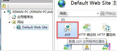 选中“Default Web Site”,双击中间的“ASP”