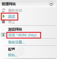 回到IIS,如果右侧显示停止,就选择启动,然后点击下面的浏览网站,就可以打开你绑定文件夹里面的网站了