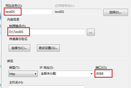 主要修改三个地方,“网站名称”、“物理路径”、“端口”,如果局域网,请修改“IP地址”